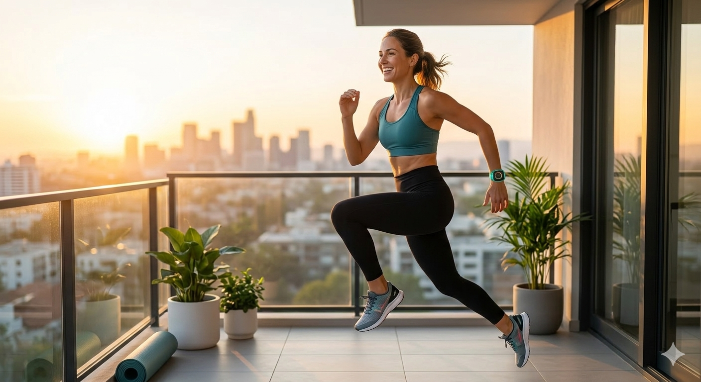 일출이 보이는 도시 배경의 테라스에서 활기차게 고강도 인터벌 운동을 하고 있는 여성의 모습